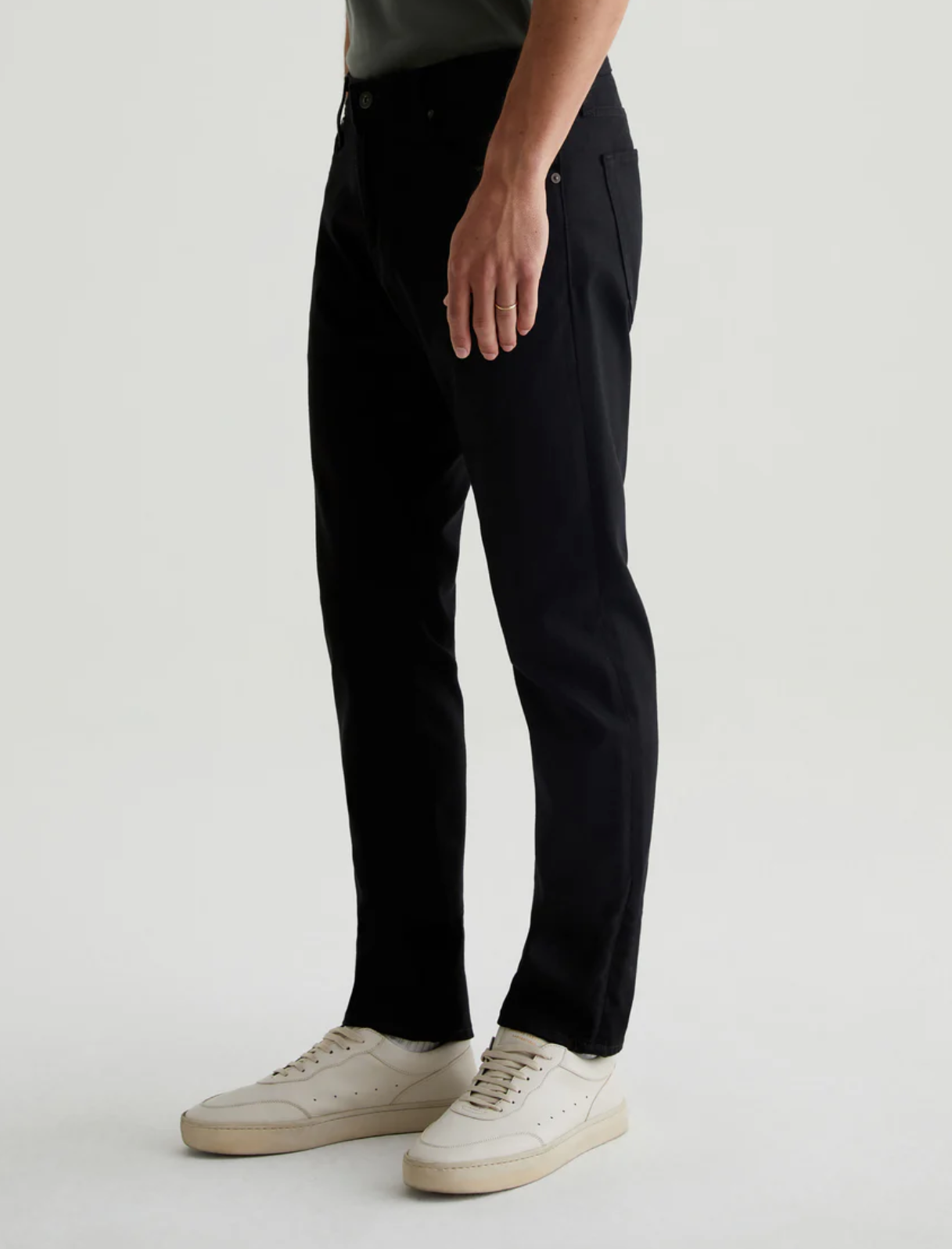model wearing ag jeans tellis modern slim twill pants in folkestone grey, shown from the waist down