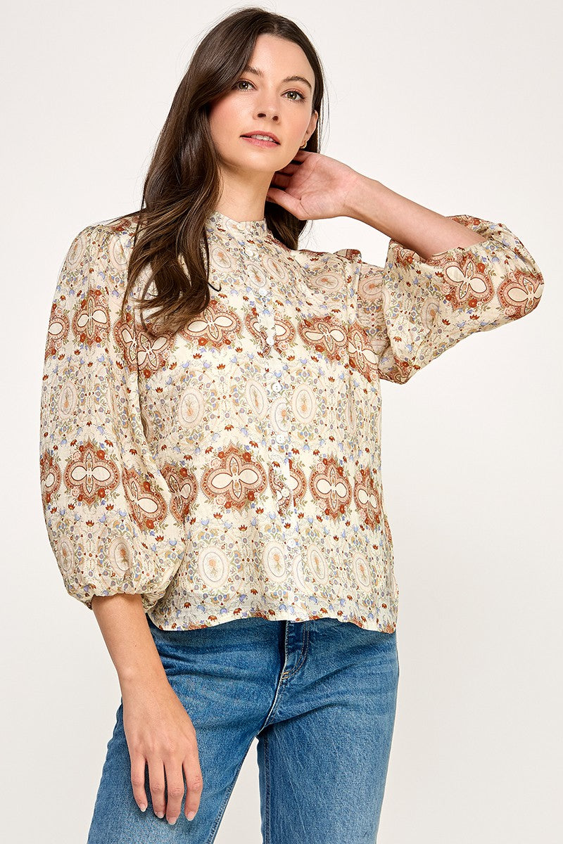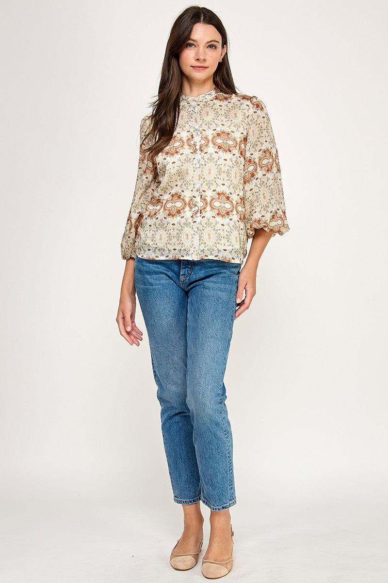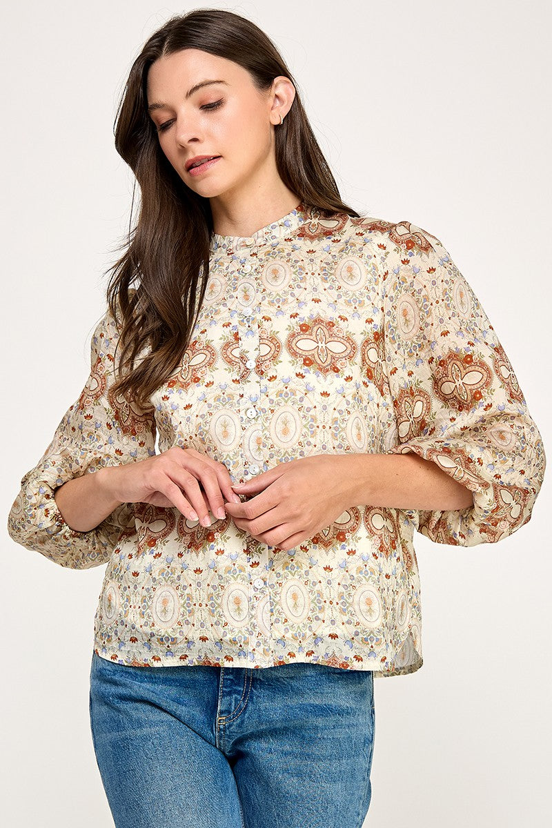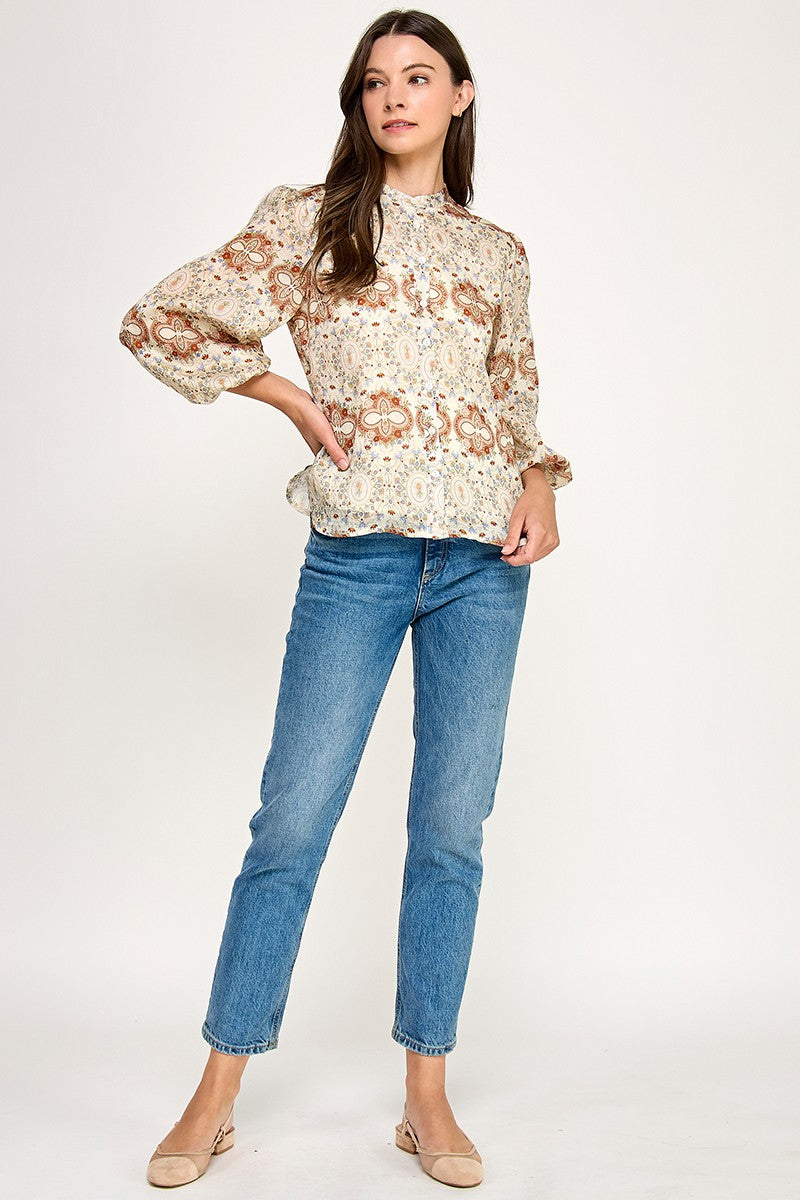 FLORAL JACQUARED RUFFLE TRIM RAYON BLOUSE