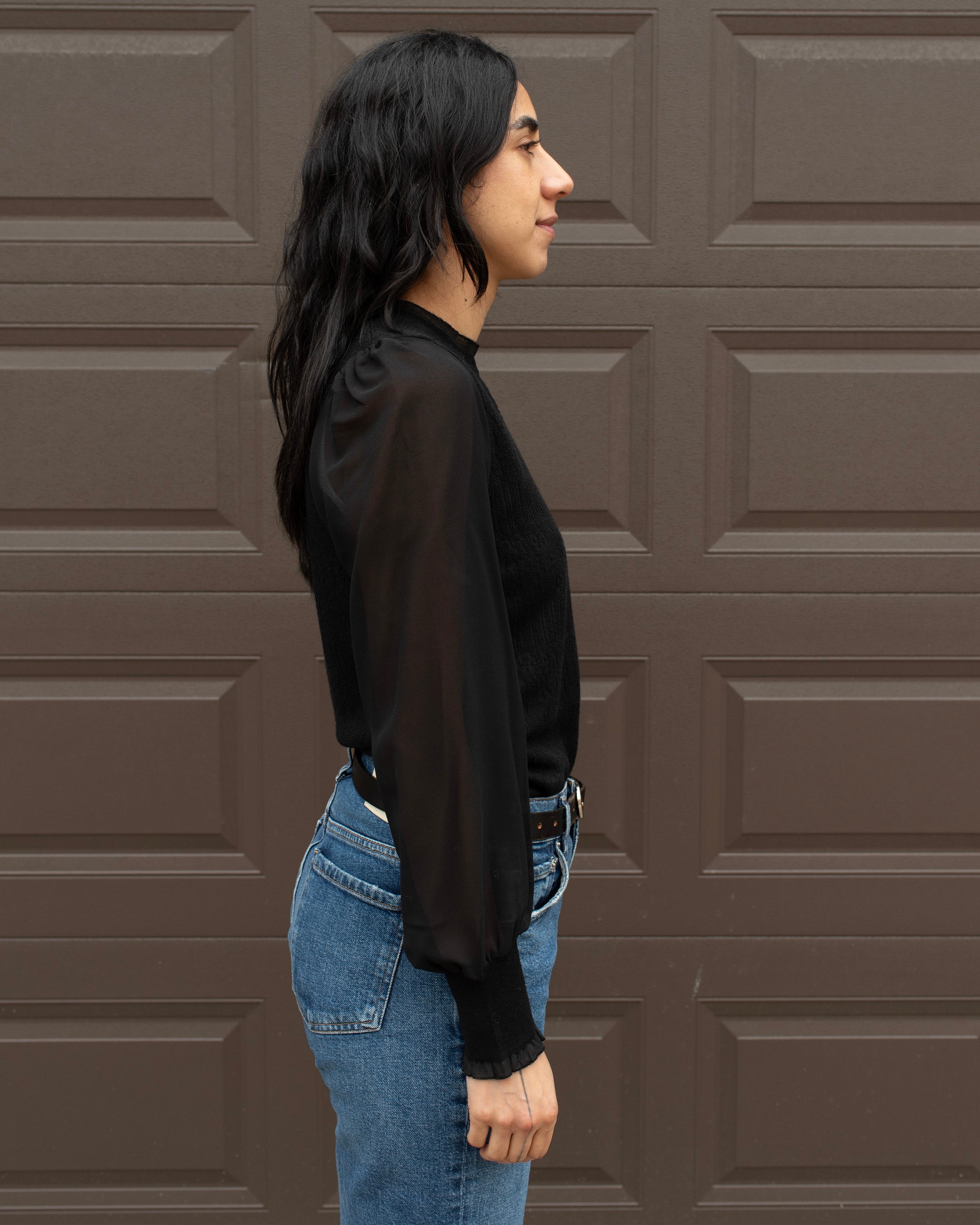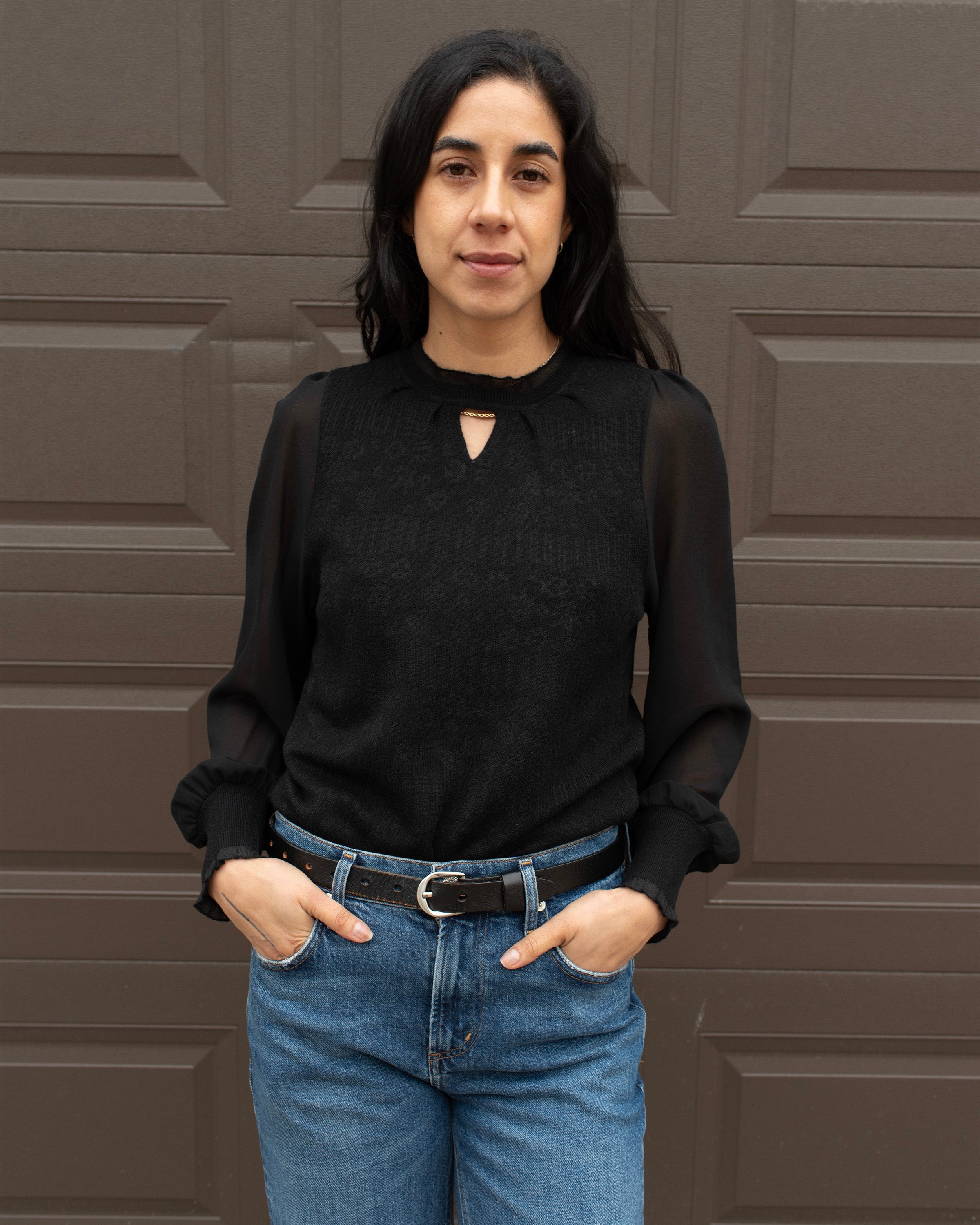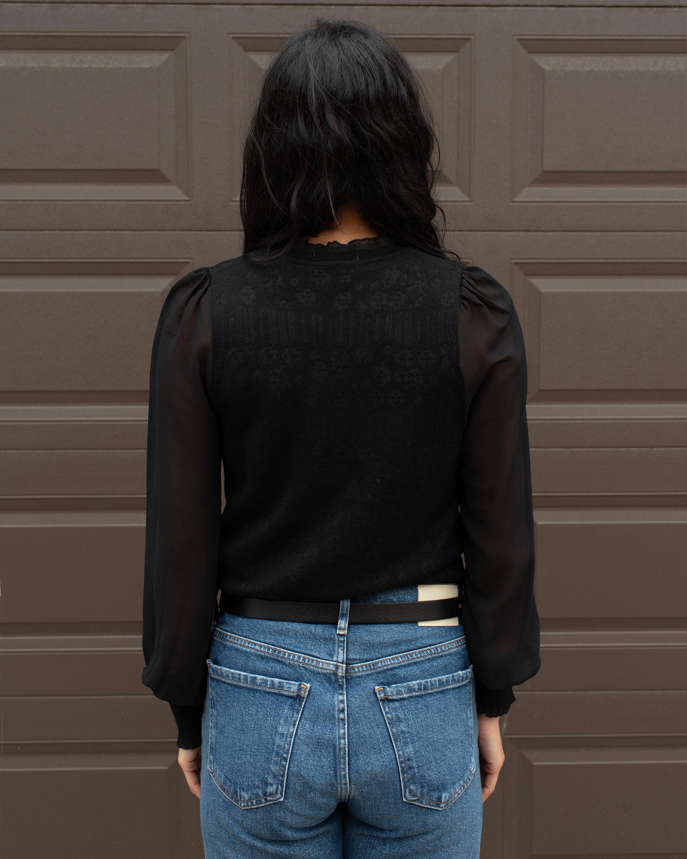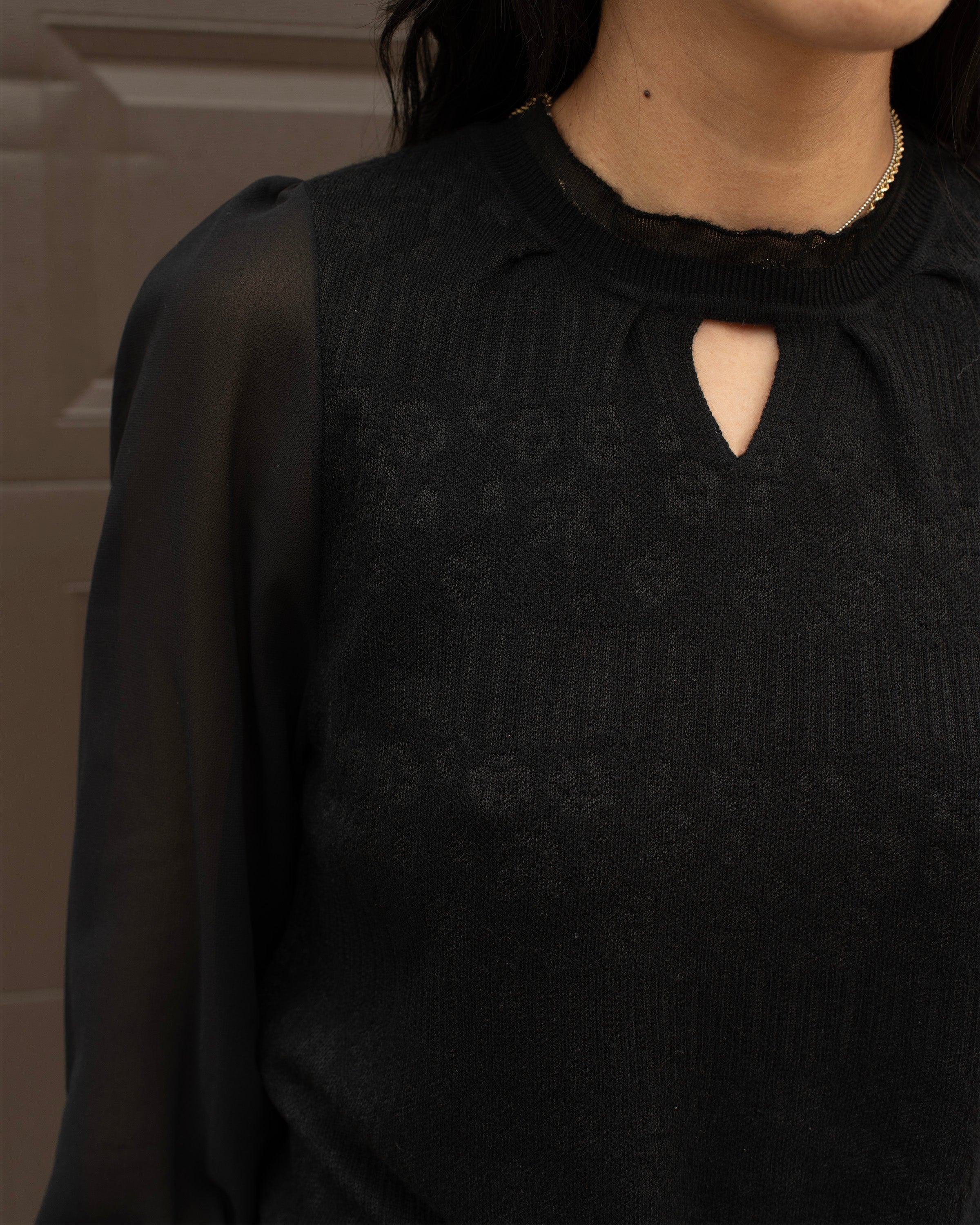 SHEER SLEEVE KNIT TOP WITH KEYHOLE