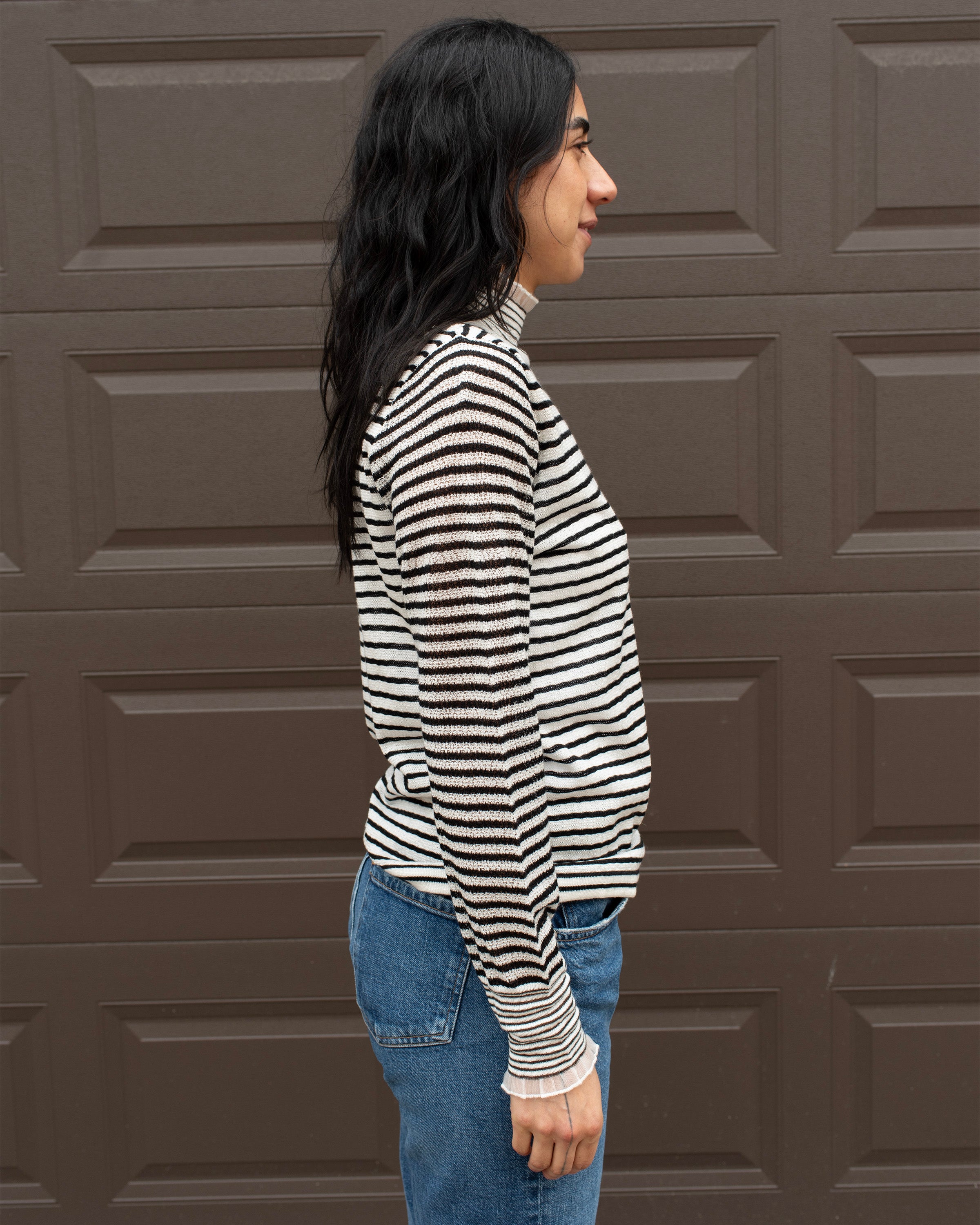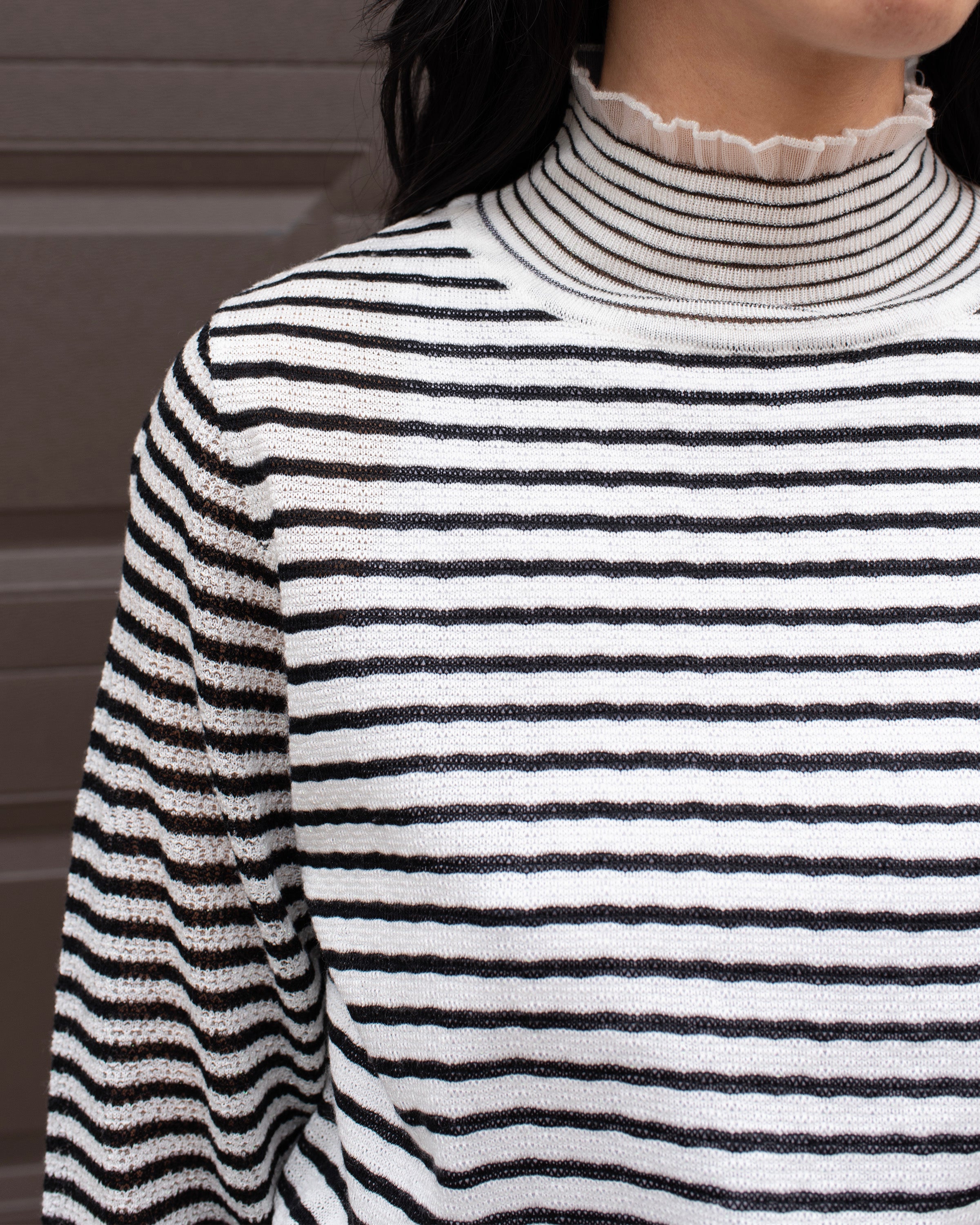 STRIPED FINE KNIT RUFFLE TRIM TOP