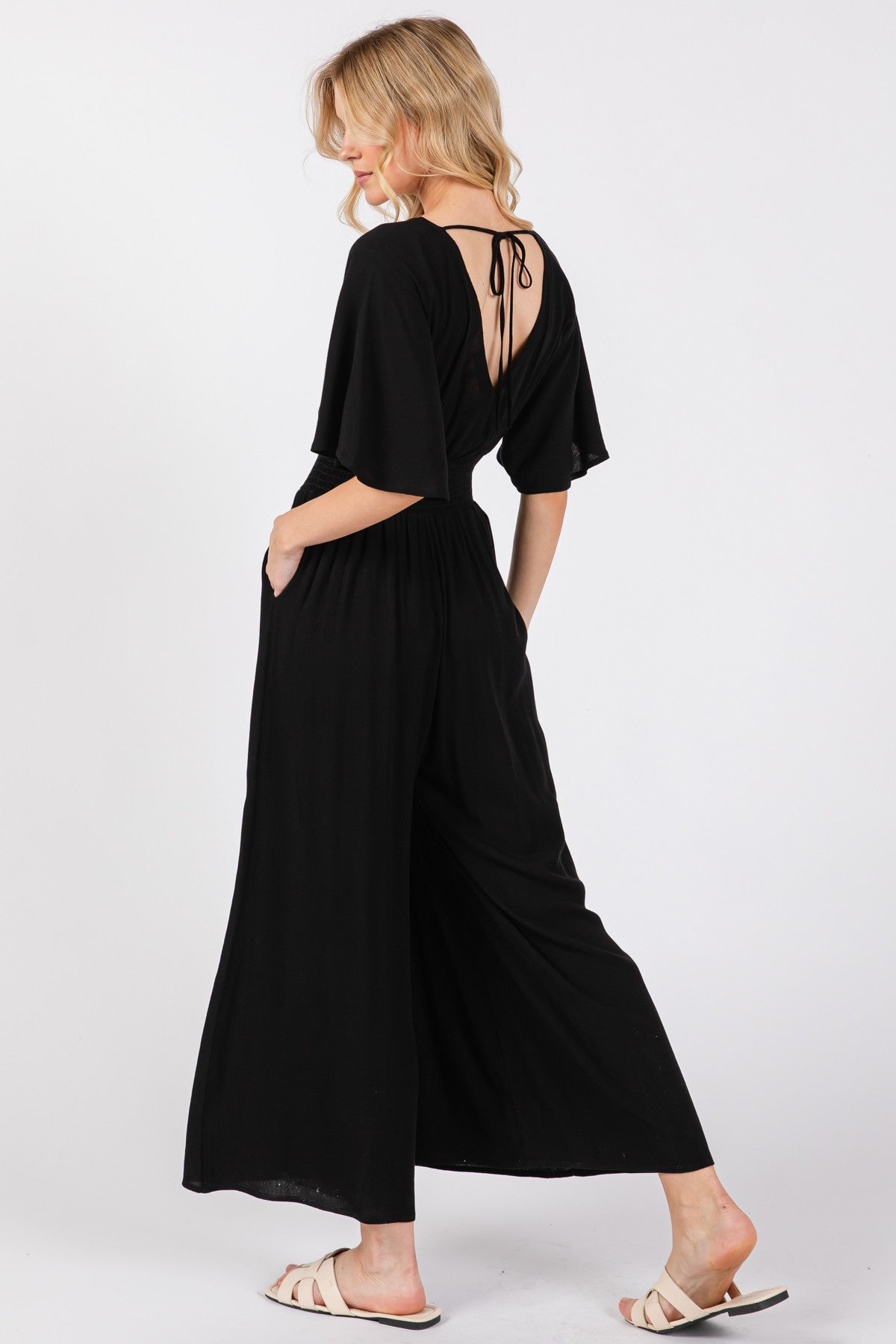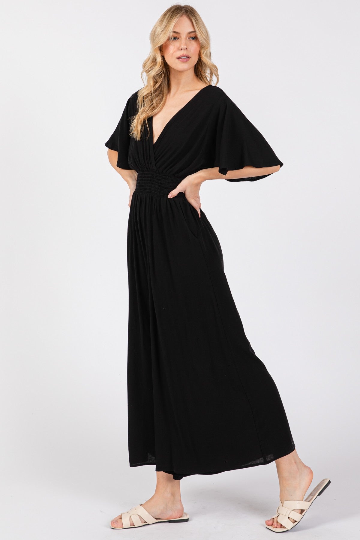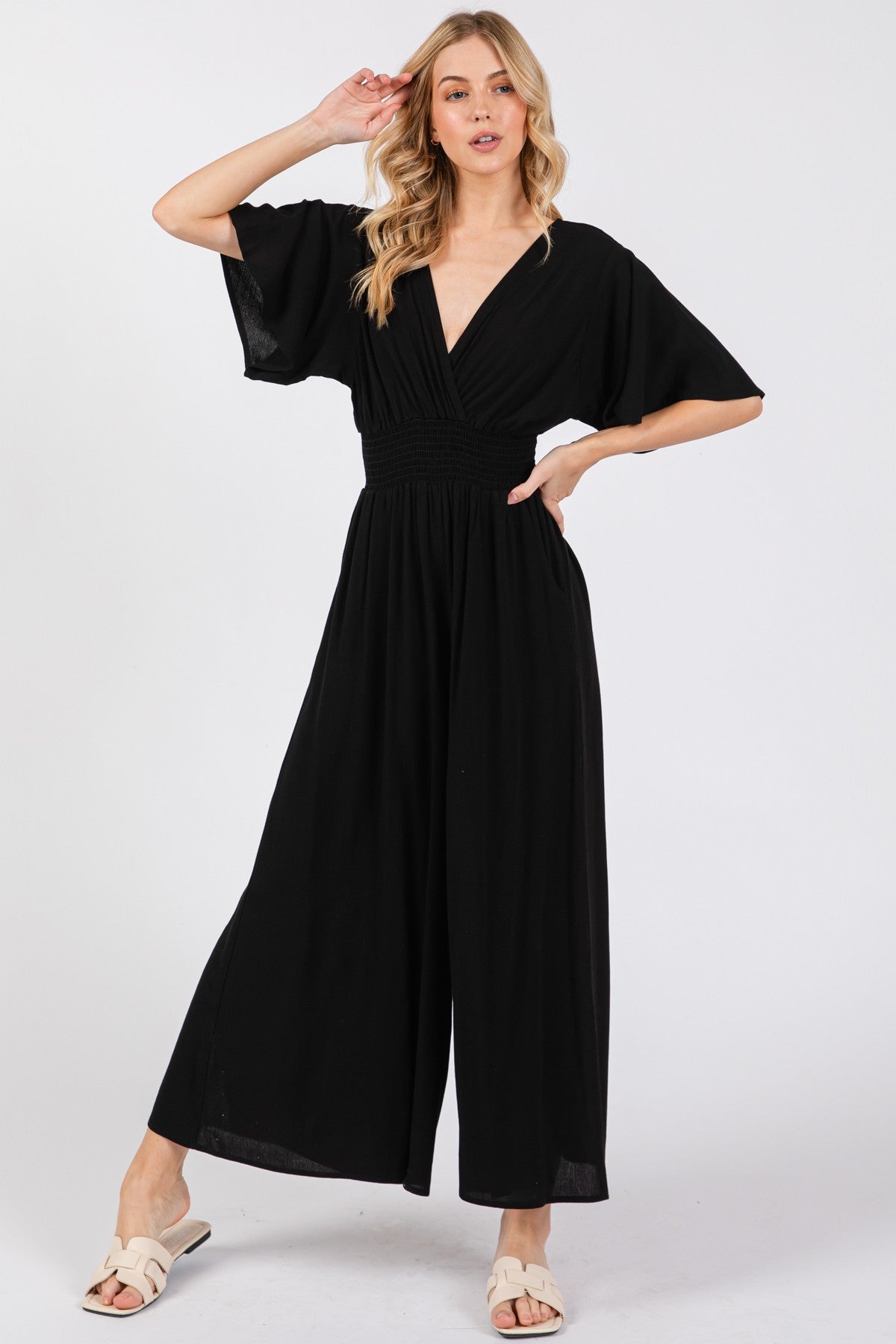 SHORT SLEEVE SMOCKED WAIST JUMPSUIT