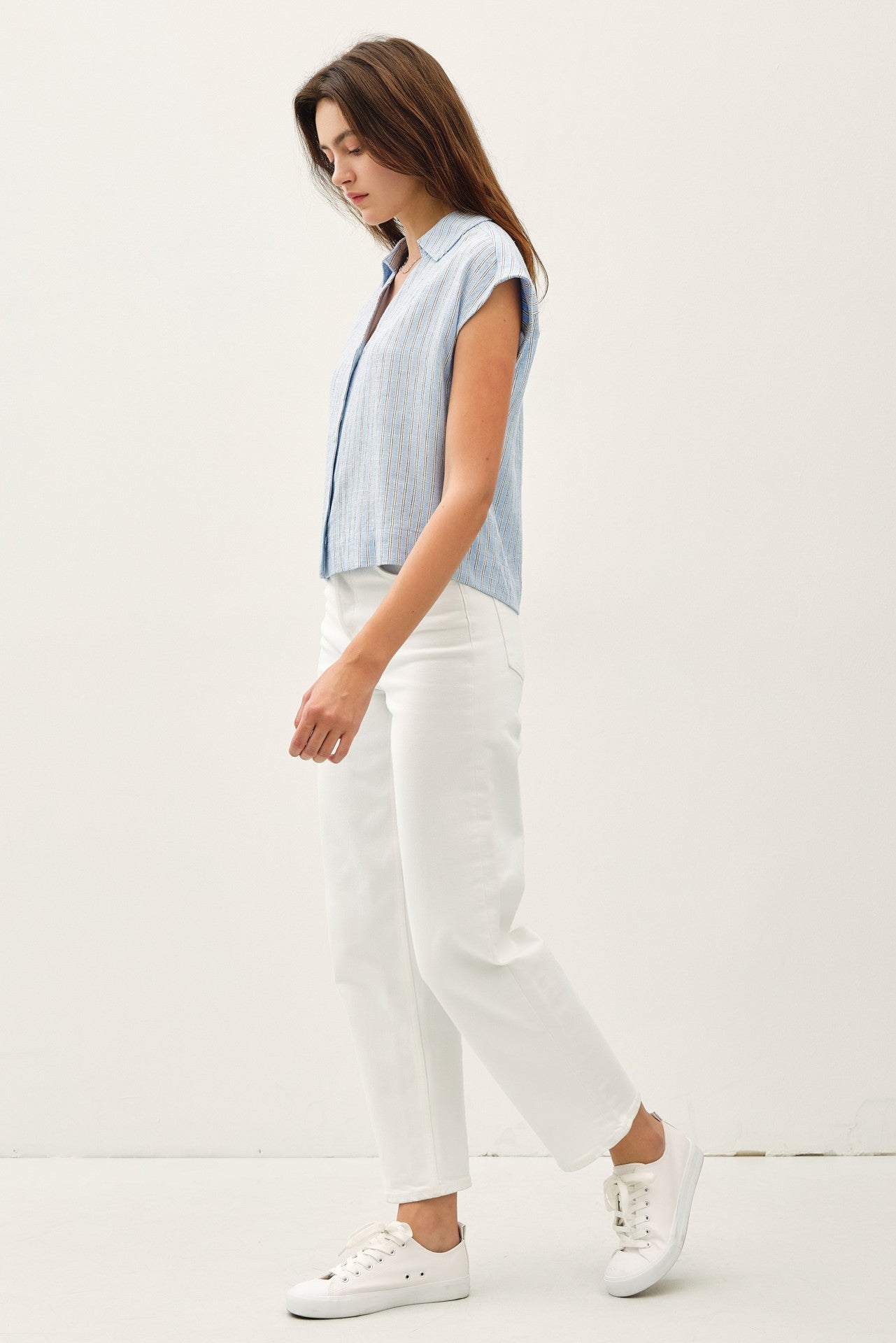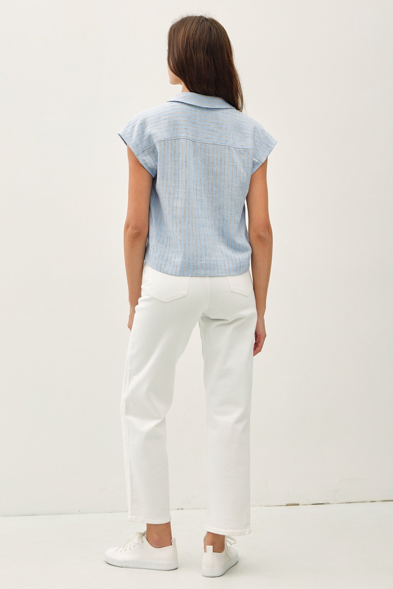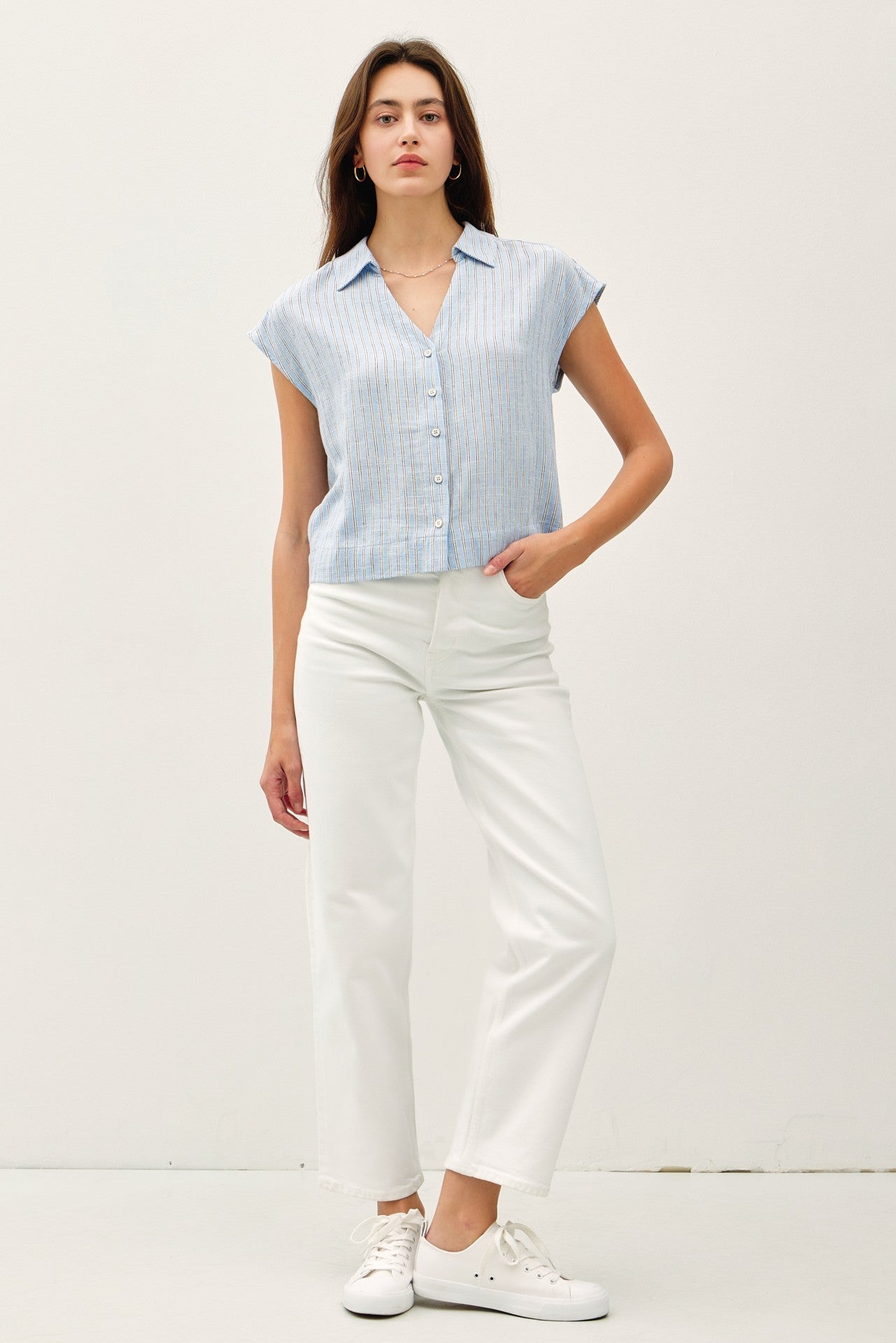 STRIPED LINEN BLEND V-NECK BLOUSE