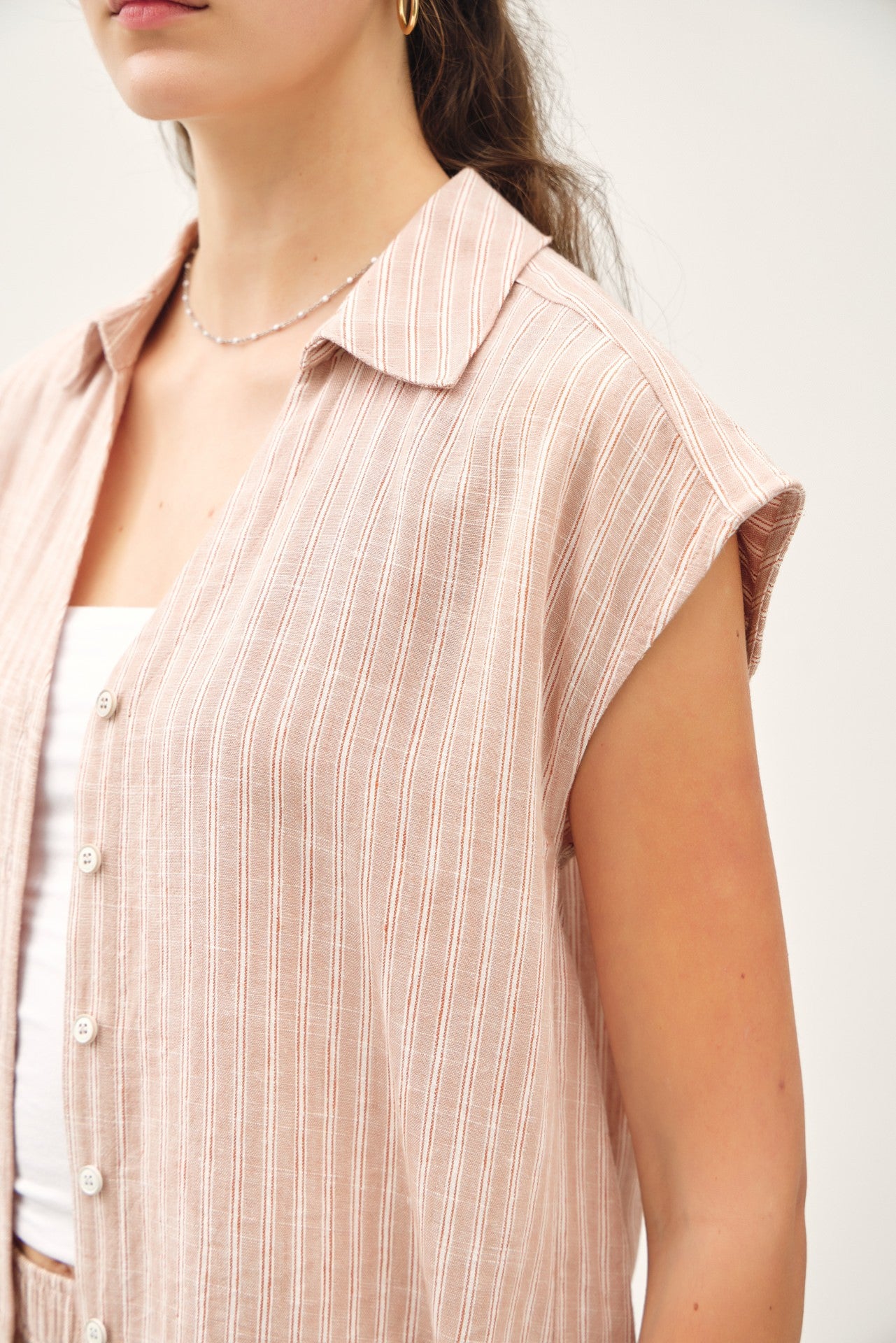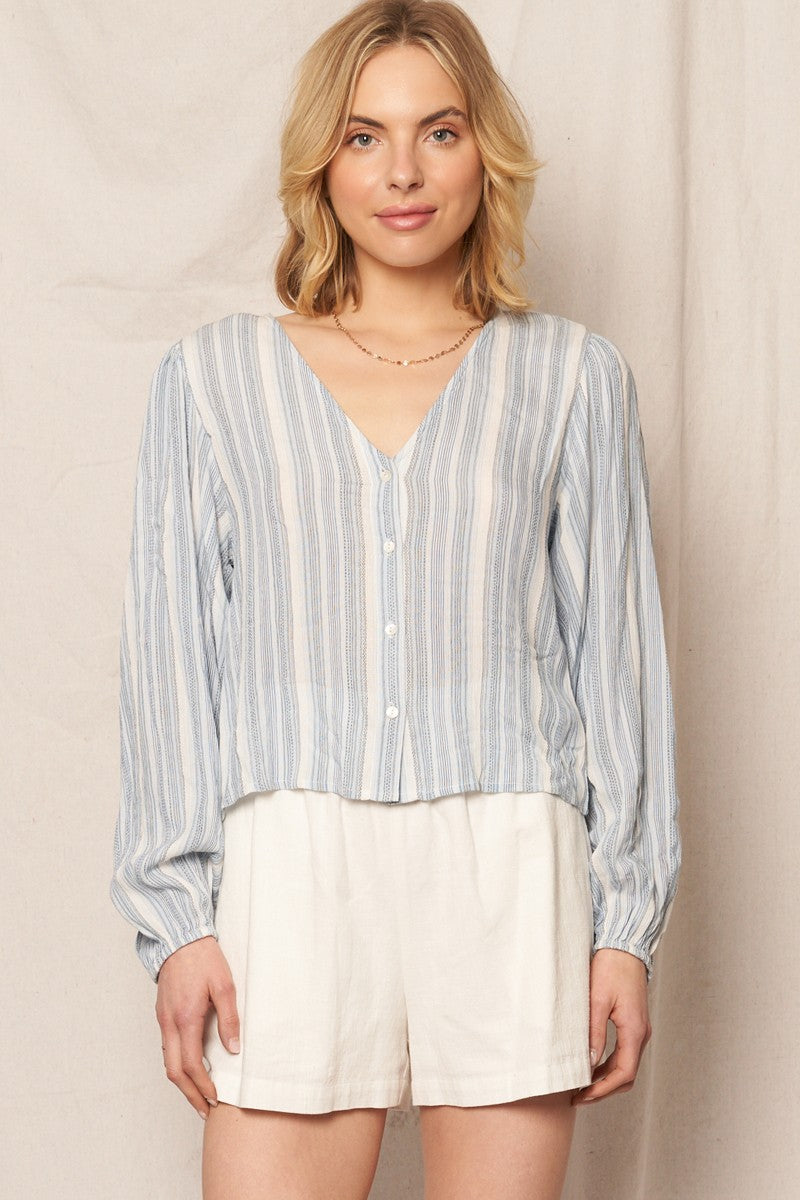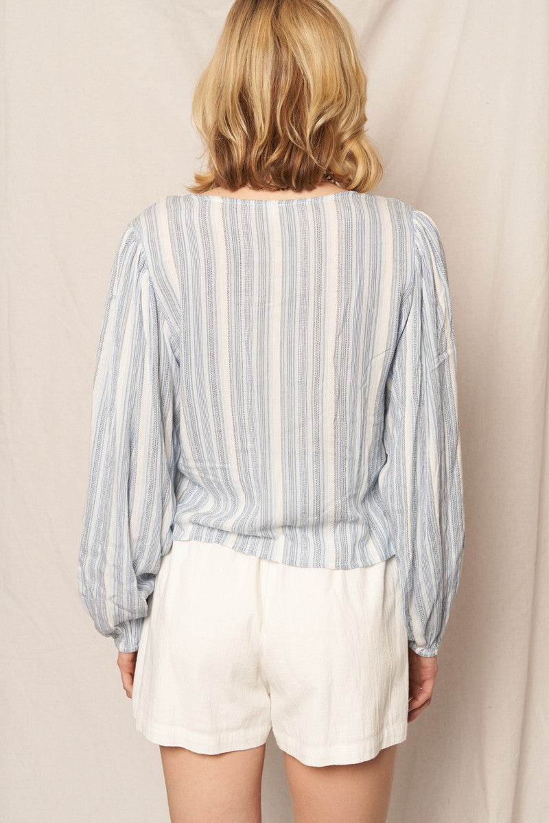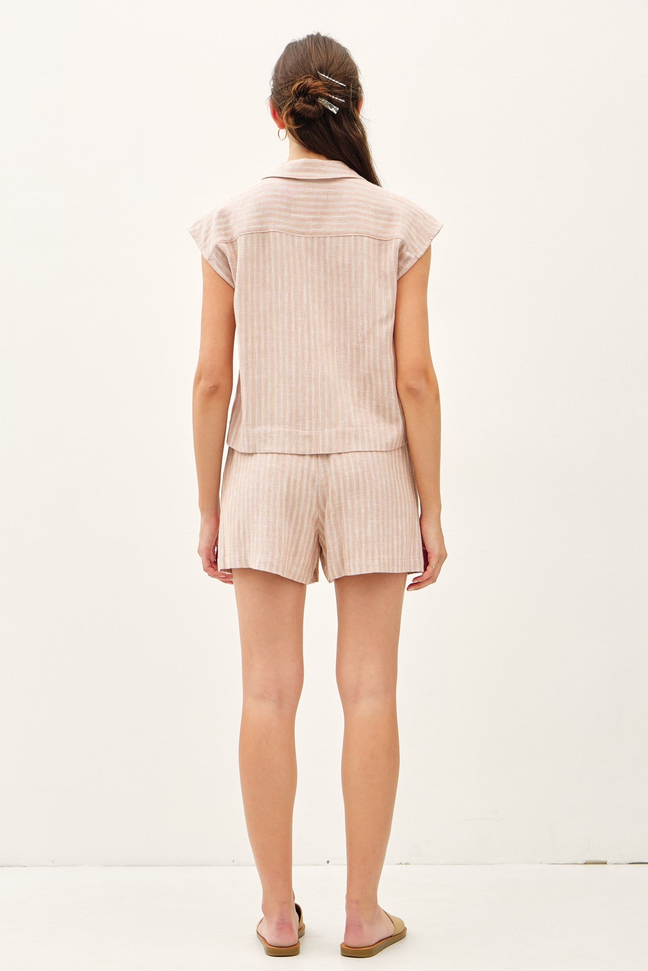 STRIPED LINEN BLEND V-NECK BLOUSE