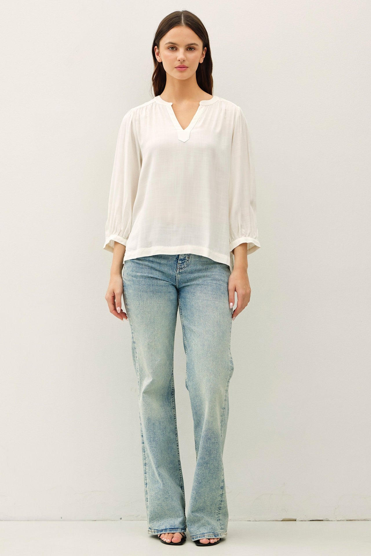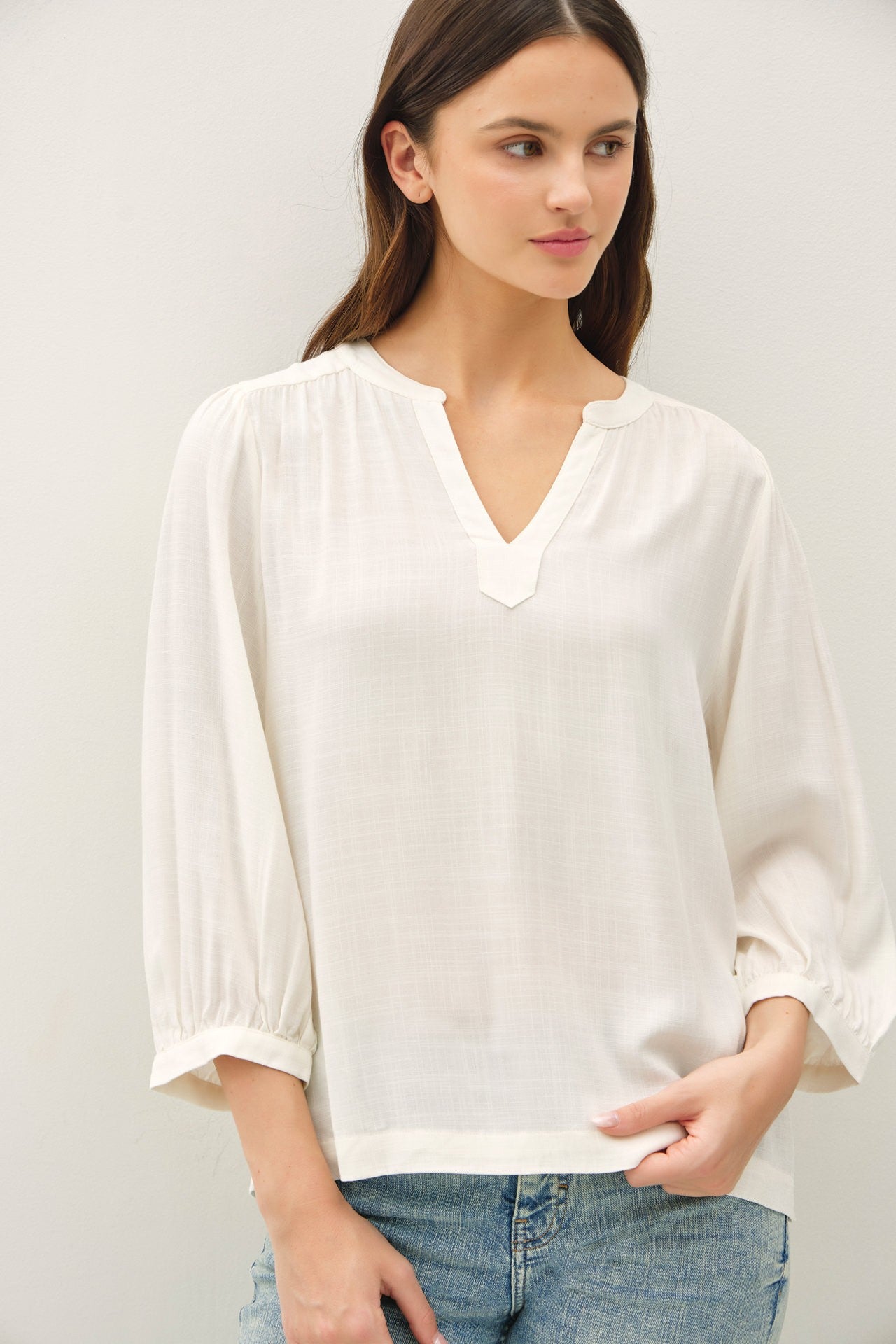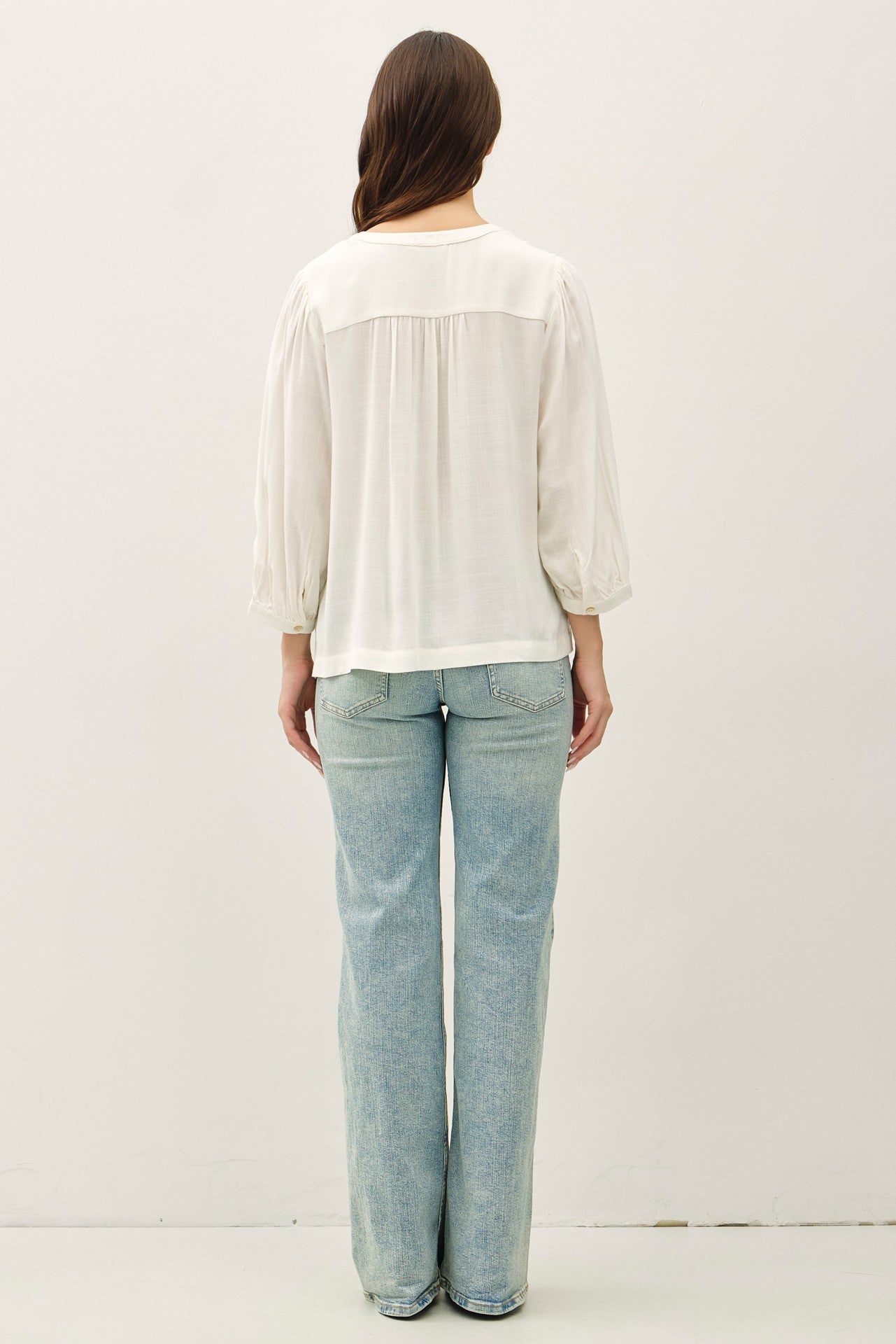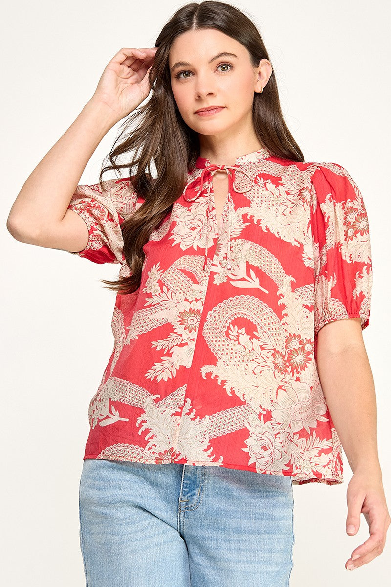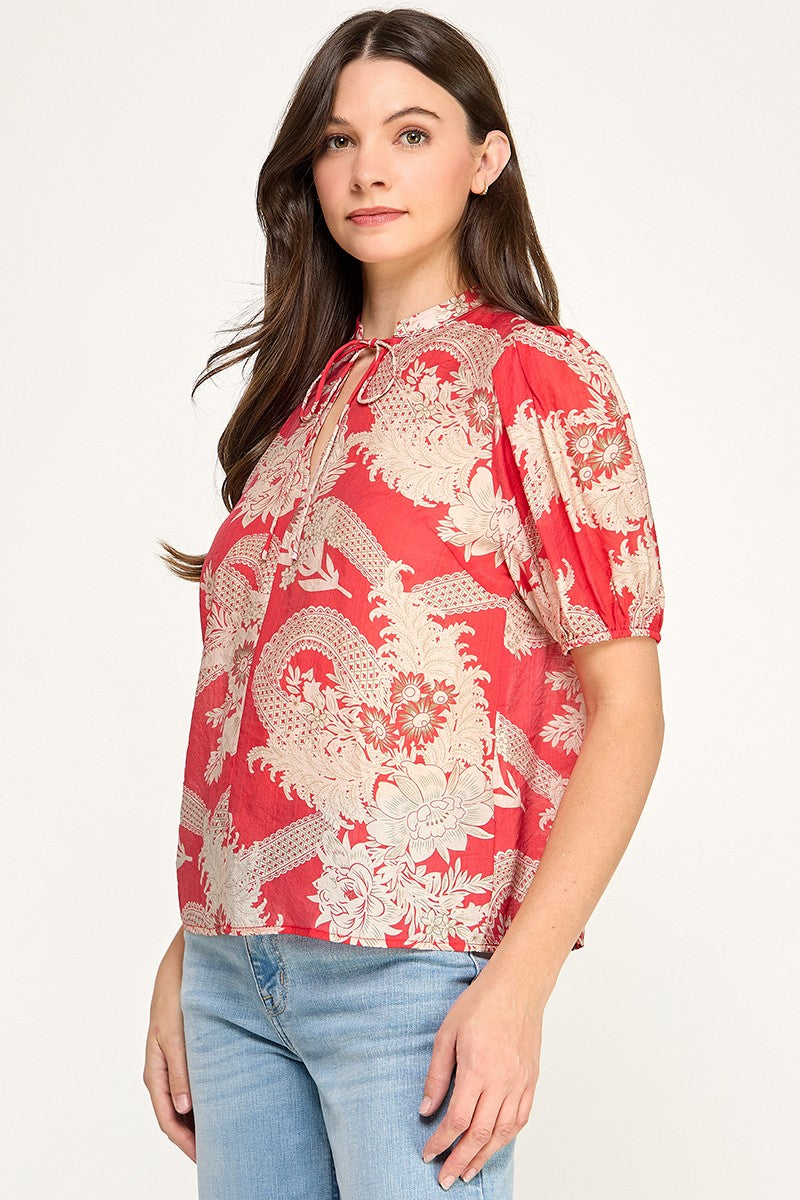 SKETCHED FLORAL SPLIT NECK PUFF SLEEVE BLOUSE