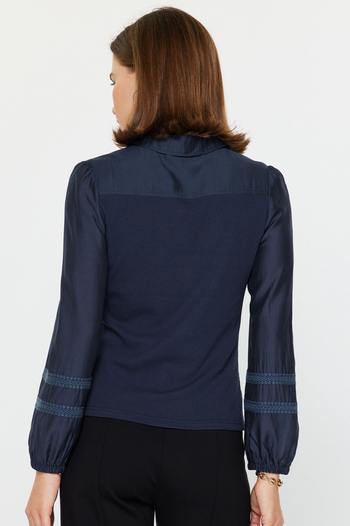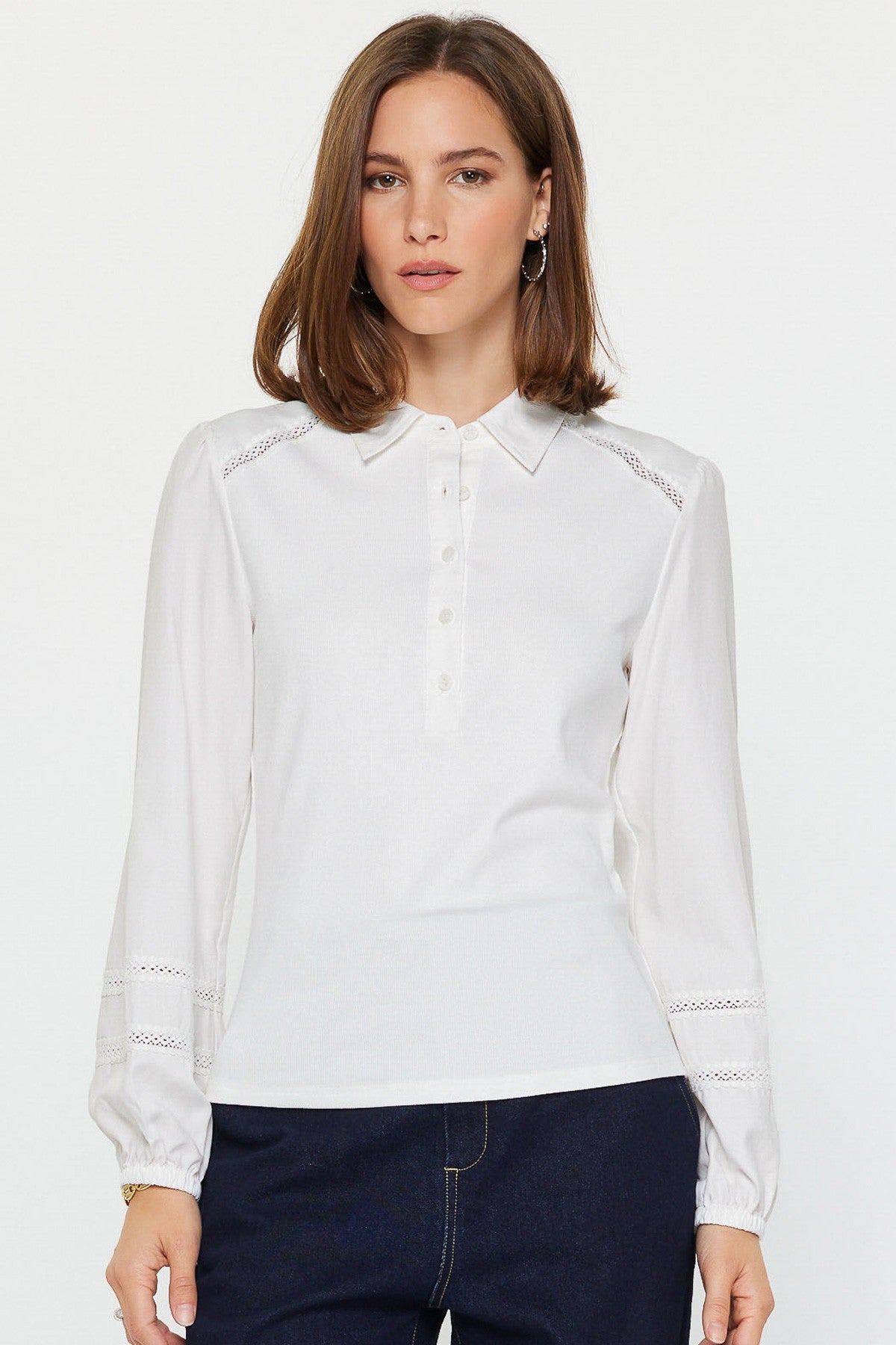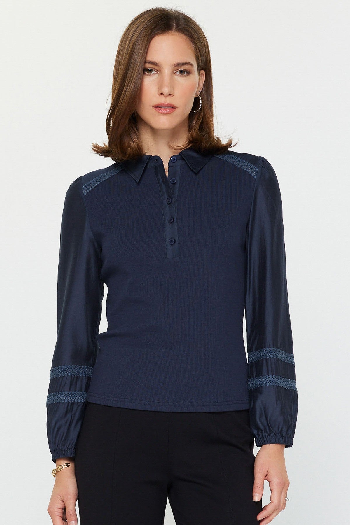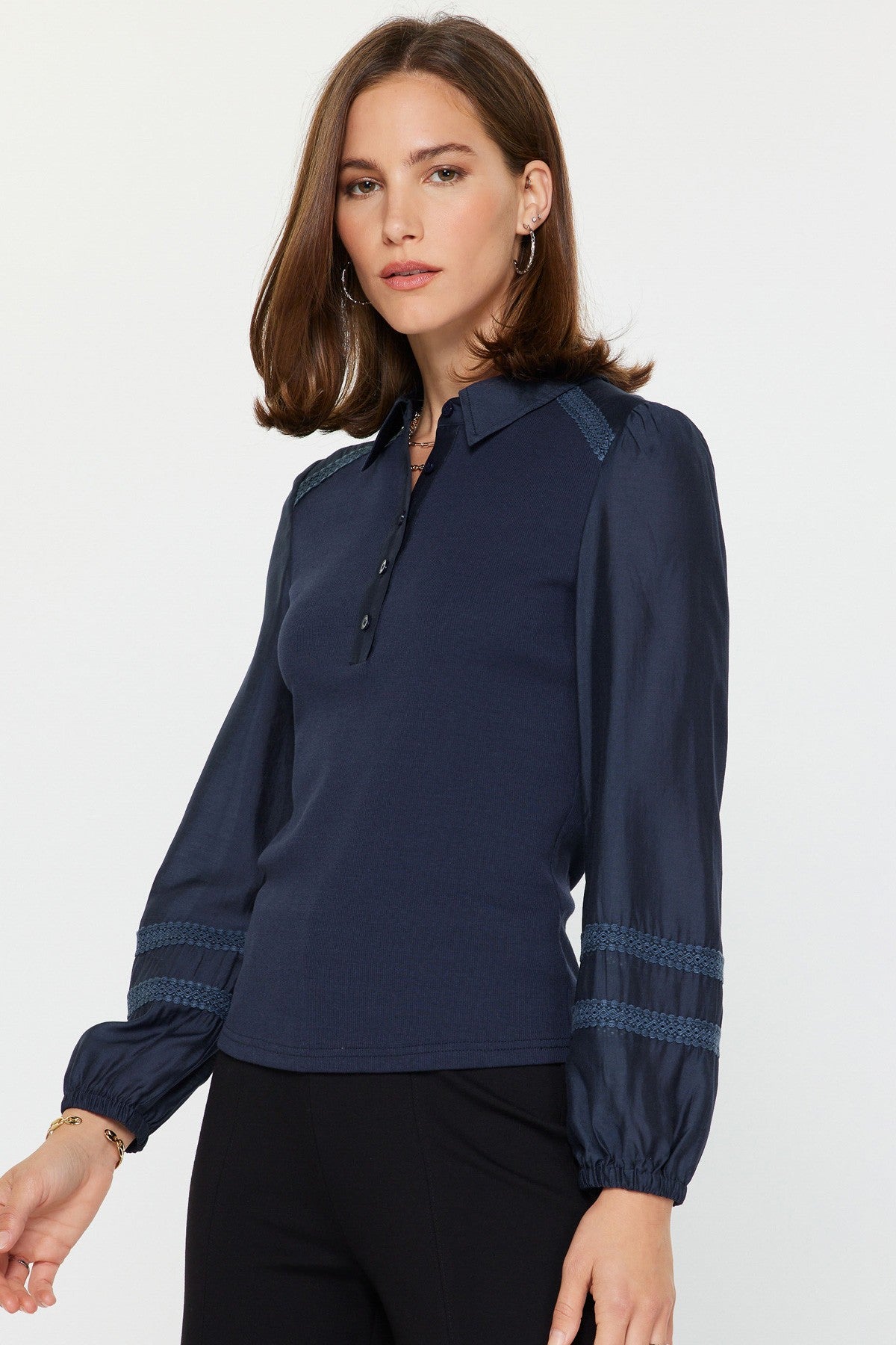 LACE TRIM MIXED MEDIA POLO COLLAR TOP